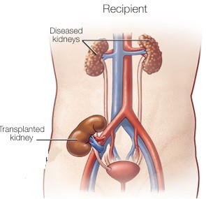 In kidney transplant a 6-7 inches cut is is made usually on right (sometimes left) side of lower abdomen. Through this cut kidney obtained from the donor is placed in the body of the recipient. All the tubes that carry blood into the kidney (artery) and blood (vein) and urine (ureter) out of the kidney are attached to recipient’s tubes. The native kidneys are not removed until there is some compelling reasons to remove them like urinary stones, urine infection etc.