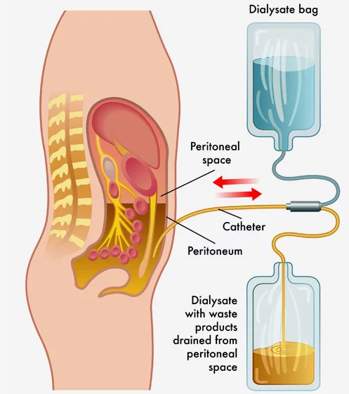- Continuous ambulatory peritoneal dialysis (CAPD): For this type of blood filtration process a plastic pipe called CAPD catheter is placed inside the abdomen. A specially prepared fluid is then instilled in the abdomen through this plastic pipe. In due course of time exchange of fluid occur between this fluid and blood essentially removing toxins and water. The fluid is drained thereafter and discarded. The pipe remains in the abdomen and the outer part of CAPD catheter is kept clean and covered